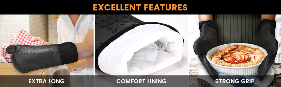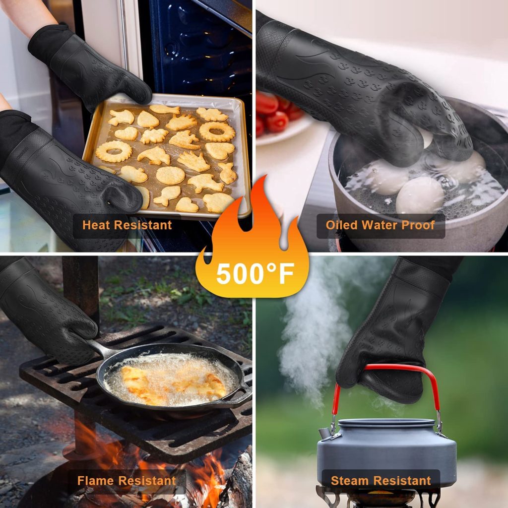 - 【Waterproof & Steam-Resistant】These heavy-duty oven mittens are unlike cotton oven gloves as the silicone part is waterproof, so hot liquid does not soak through. You can use them to remove items from hot water without worrying about burning yourself.
