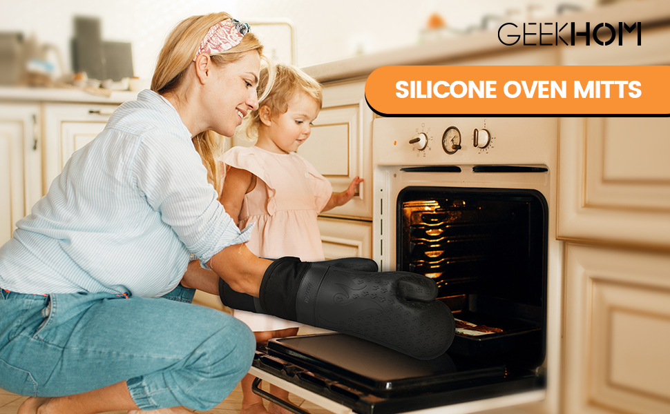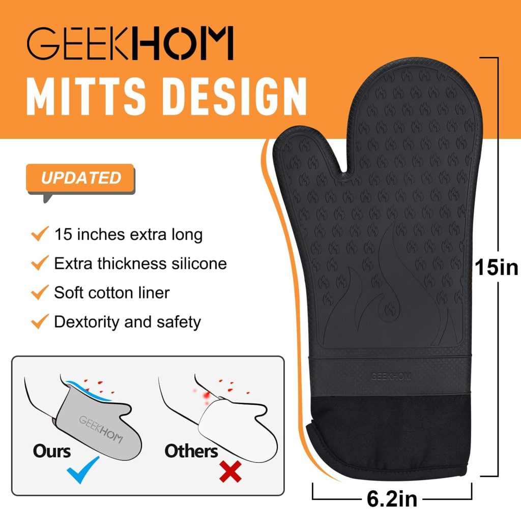 - 【Better Grip from Unique FIRE Design】The GEEKHOM oven mitts feature a unique silicone non-slip fire-textured surface, helping you to always retain a strong grip while cooking and baking. The unique fire-textured design improves your control and stability across hot, heavy, and smooth items.