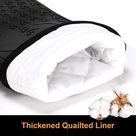 - 【500 F Heat-Resistant】The mitts are made of durable and food-grade silicone that withstands temperatures of up to 500°F. The soft cotton lining provides advanced protection and increased comfort, meaning you can work easily with it on hot flames, oven, stove, and grill.