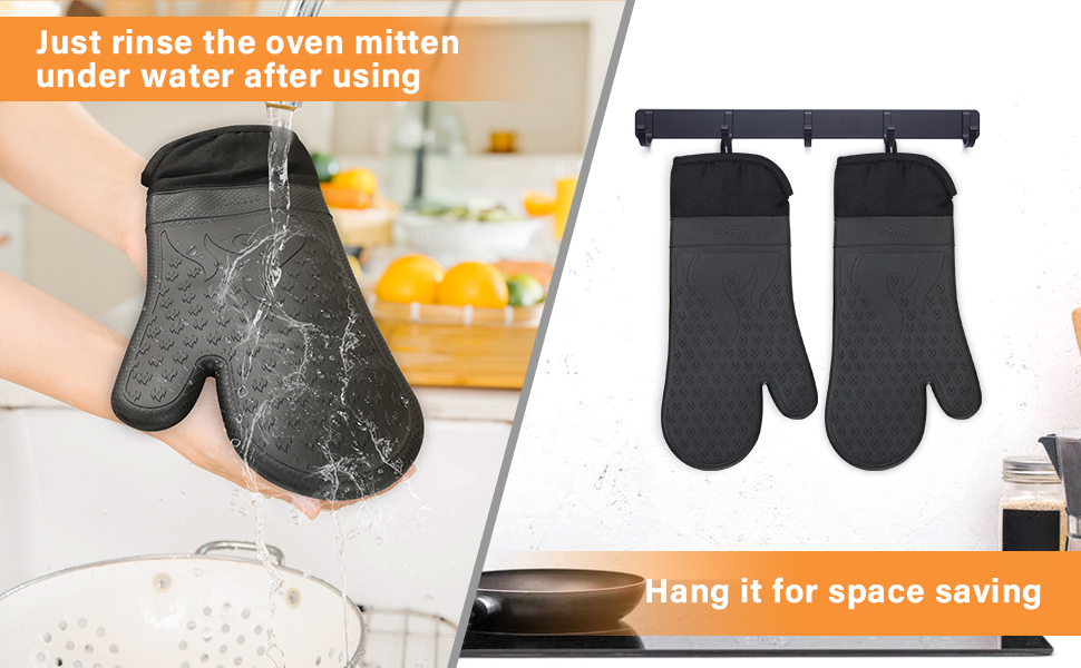 - 【Easy To Clean & Store】Compared with cotton oven gloves, these silicone oven gloves are stain-resistant and easy to clean. Just rinse them in water or wipe them down with a wet cloth after use; they are also machine washable. Besides, they feature a loop, so they are easy to store and space-saving.