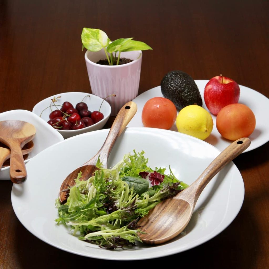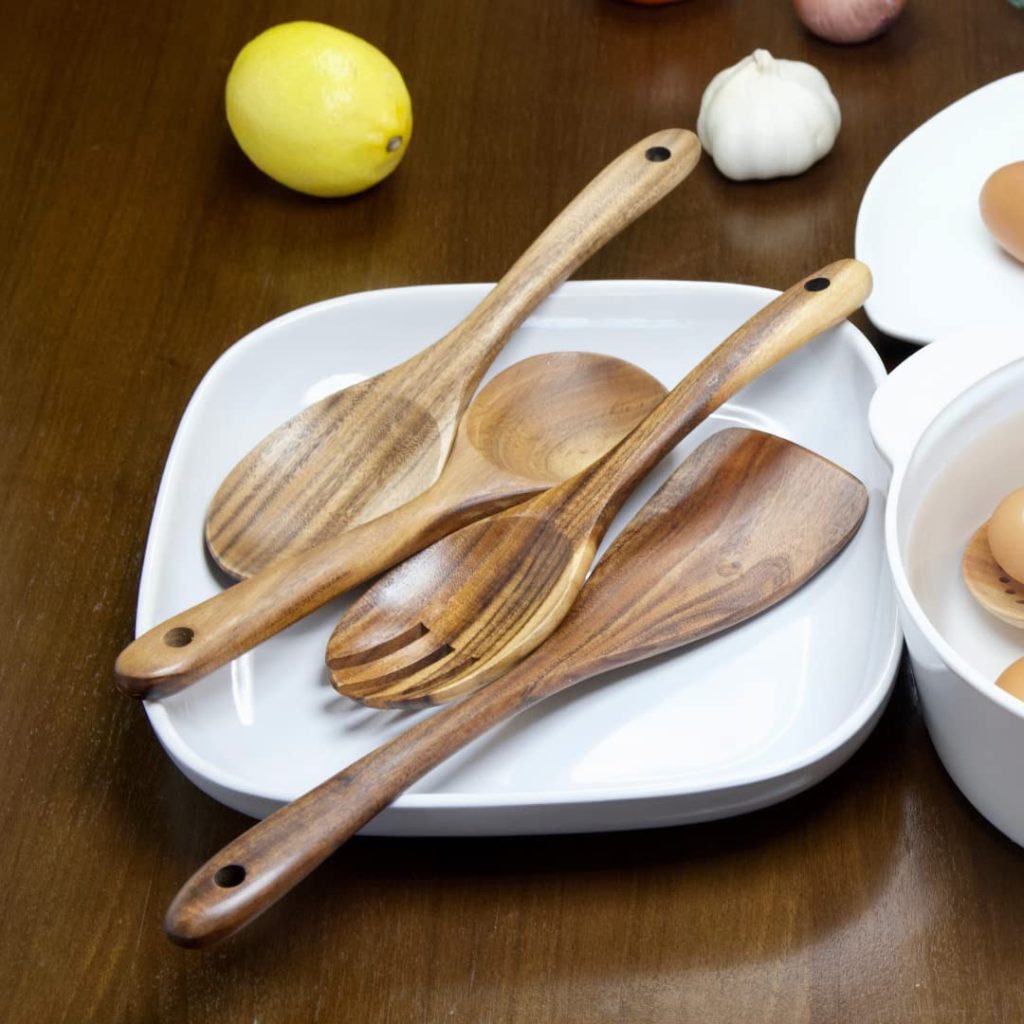 No risk of food contamination - Our wooden utensils set is made of solid wood. It will not contaminate your delicious home-cooked food. Since it is solid wood, it will not leach chemicals into your food. So, you can have your worry-free, and toxic-free food.